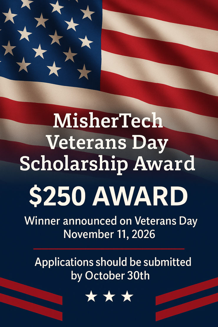Join us this Veterans Day as MisherTech honors the service and sacrifice of U.S. veterans and their families. We are proud to announce the MisherTech Veterans Day Scholarship Award, a $250 scholarship to support educational costs for a veteran, active-duty service member, or dependent pursuing higher education, trade school, or technical certifications.